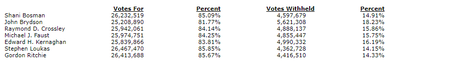 By resolutions passed by ballot vote, the seven nominees as shown in the attached table proposed by management were elected as directors of the company to hold office until the next annual meeting of shareholders or until their successors are elected or appointed.
