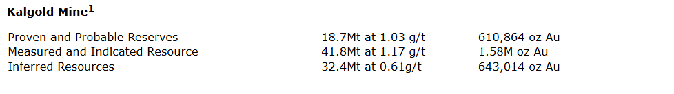 One Bullion controls approximately 65 linear kilometres of strike along the western limb of the Kraaipan greenstone belt in Botswana which contains multiple past-producing mines, and the currently operating Kalgold mine, operated by Harmony Gold. The Kalgold mine has been in continuous production since 1996 and based upon public disclosure by Harmony Gold, as of June 30 reported proven and probable reserves of 610,864 ounces of gold, a measured and indicated resources of 1.58 million ounces of gold, and inferred resources of over 643,000 ounces of gold. The foregoing mineral resources and mineral reserves are located off property and do not form part of any properties held by One Bullion.