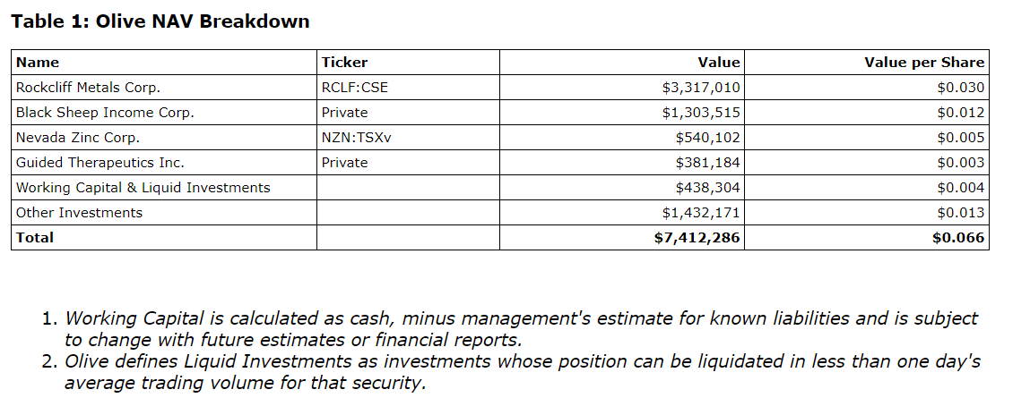 Derek Macpherson, executive chairman, stated: "The increase to our NAV is driven by the performance of Rockcliff, because of its definitive agreement with HudBay Minerals. We view this transaction as beneficial for Olive shareholders, and the anticipated change in Olive's liquidity will allow the company to better balance its investment portfolio and take advantage of the investment opportunities presented by current market conditions."