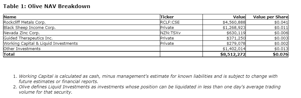 Derek Macpherson, executive chairman, stated: "Strong performance by Hudbay Minerals Inc. has driven up Rockcliff's share price, increasing Olive's NAV in the month. It is worth noting that on July 31, Olive's share price was trading at a greater-than-25-per-cent discount to the value of its Rockcliff position alone and closed the month at a greater-than-60-per-cent discount to NAV per share. With this valuation gap in mind the company plans to continue with the ongoing normal course issuer bid (NCIB)."