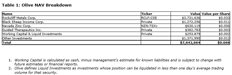 Olive Resource Capital Inc. has provided investors an updated, unaudited net asset value (NAV) per share. Management has estimated the NAV of the company at 6.8 cents per share for Aug. 31, 2023. At the end of August, the company's price per share was three cents.