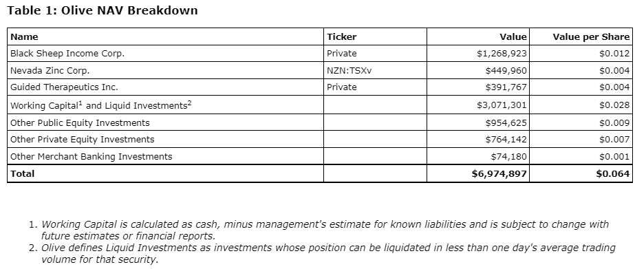 Olive is a resource-focused merchant bank and investment company with a portfolio of publicly listed and private securities. The company's assets consist primarily of investments in natural resource companies in all stages of development.