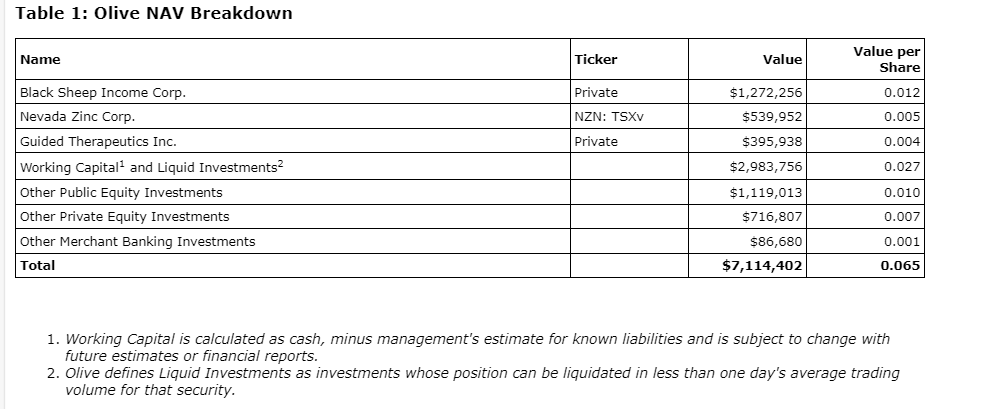 Olive Resource Capital Inc. has provided investors an updated, unaudited net asset value (NAV) per share. Management has estimated the NAV of the company at 6.5 cents per share for Feb. 29, 2024. At the end of February, the company's price per share was 2.5 cents.