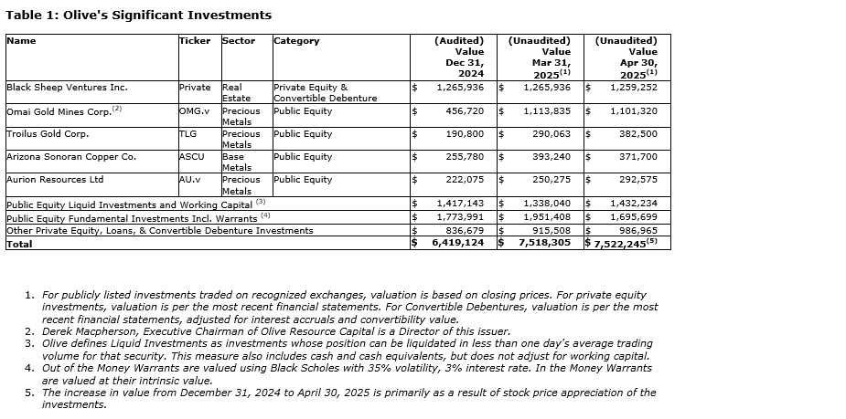 Derek Macpherson, executive chairman, stated: "The work that we have done over the last three years to increase Olive's balance sheet flexibility has allowed us to be more aggressive in allocating investment dollars to the high conviction names in our portfolio. This has put us in the ideal positions to potentially deliver significant returns in the current very positive gold environment and the strong broader commodity market that we anticipate in the next few years."