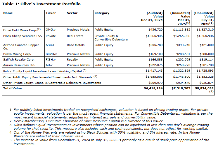 Olive Resource Capital Inc. has provided investors with an update on its investments for the period ending July 31, 2025.