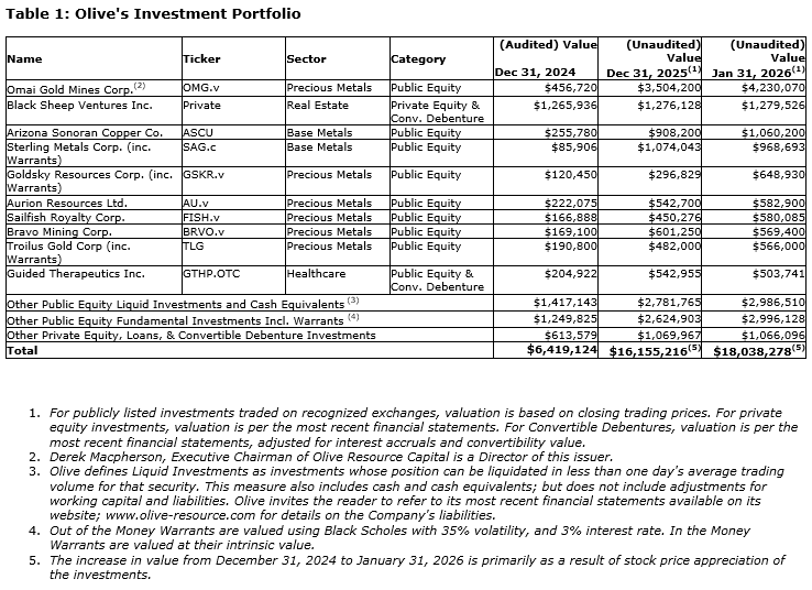 OLIVE RESOURCE CAPITAL PROVIDES UPDATE ON INVESTMENTS FOR JANUARY 2026