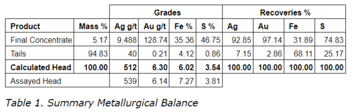 The resulting gold and silver flotation concentrate yielded 9,488 grams per tonne of silver and 128 grams per tonne of gold;