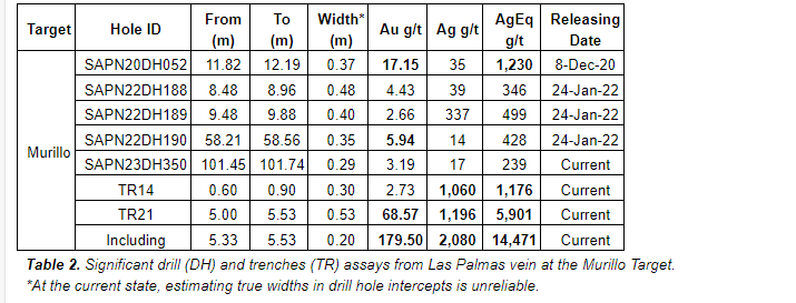 - Las Abejas shoot at El Dorado vein: Drill hole DH317 revealed a remarkable intercept of 5.28 metres (true width of 3.05 metres) containing 16.08 grams per tonne gold and 2,719 g/t silver.