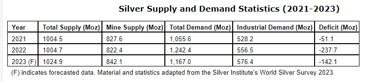 Statistics from the Silver Institute's World Silver Survey 2023 paint a clear picture of this emerging trend with an estimated 12-per-cent deficit in supply versus demand. Over the last three years, the total deficit is estimated at 431 million ounces of silver. This amount is staggering, equating to approximately 4.5 months of the entire world supply of silver, or around six months of the entire world supply of silver from all mines. This significant deficit underscores the urgency and potential for silver price appreciation.