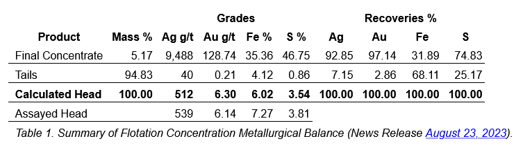 The results of the final locked cycle flotation metallurgical balance for sample PAR-02 demonstrated exceptional recovery rate, achieving 97.14 per cent for gold and 92.85 per cent for silver (Table 1), This process produced a high-grade concentrate grading of 128.74 grams per tonne of gold and 9,488 grams per tonne of silver (see News Release dated