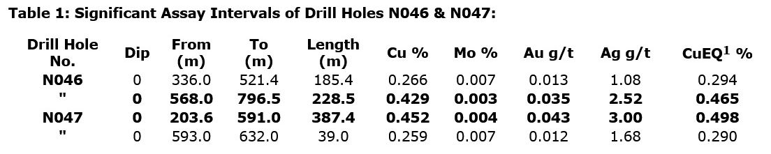 Drill hole N045 (Plate NZ-47) returned 329.8 m of 0.494 % CuEQ