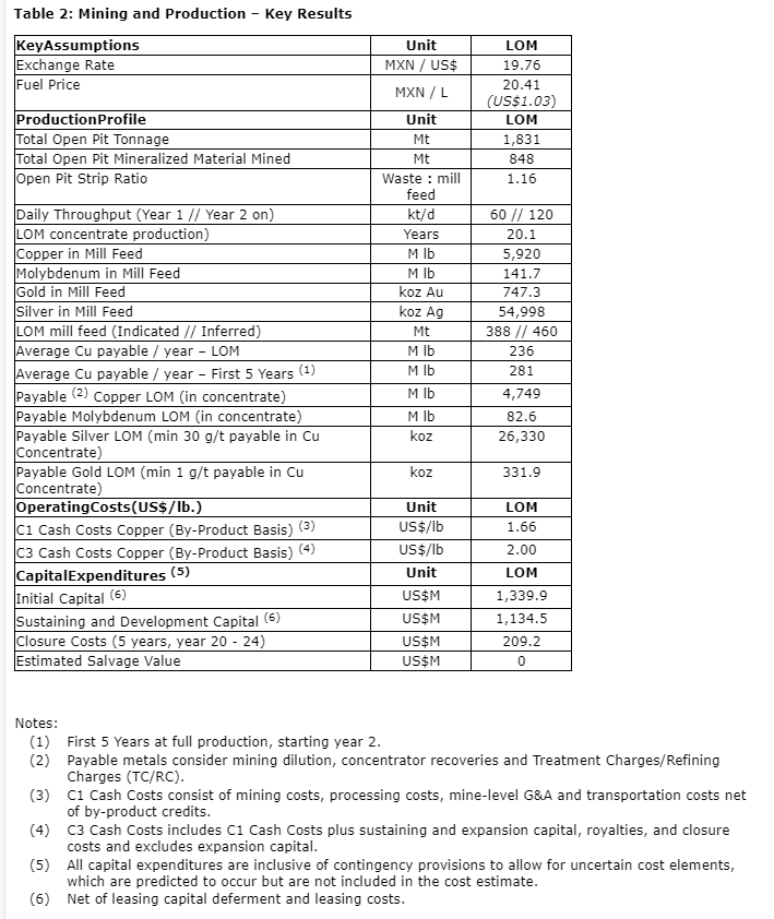 The PEA mine design, prepared by Mining Plus, contemplates open-pit development that ensures no incursion upon the Huites reservoir, maintaining a 100 m berm between the reservoir high water mark and the pit limit thereby remaining outside of CONAGUA's (Comision Nacional del Agua; Mexican water authority) jurisdiction boundary. These constraints were selected by the company. Avoiding the CONAGUA limit and applying a series of pit slope constraints derived from preliminary geotechnical domains defined by SRK from phase 1 drilling on the project, a mineral resource within the ultimate pit design (by classification and grades) for this PEA has been defined as shown herein.