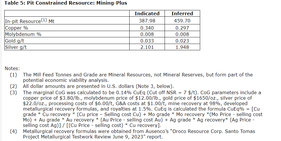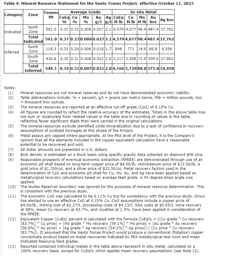 The PEA MRE was prepared by SRK Consulting (U.S.) in accordance with the Canadian Institute of Mining, Metallurgy, and Petroleum (CIM) definition standards incorporated by reference in National Instrument 43-101, with an effective date of Oct. 11, 2023. The technical report will be prepared and released by the company and will be available on Oroco's website and on SEDAR+ under the company's profile, within 45 days of this news release.