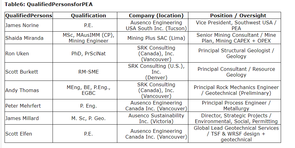 The PEA for the project summarized in this news release was prepared by Ausenco with input from SRK and Mining Plus, and will be incorporated in a technical report prepared in accordance with NI 43-101 which will be available under the company's SEDAR+ profile and on the company's website within 45 days of this news release. The affiliation and areas of responsibility for each of the qualified persons involved in preparing the PEA, upon which the technical report will be based, are as noted herein.