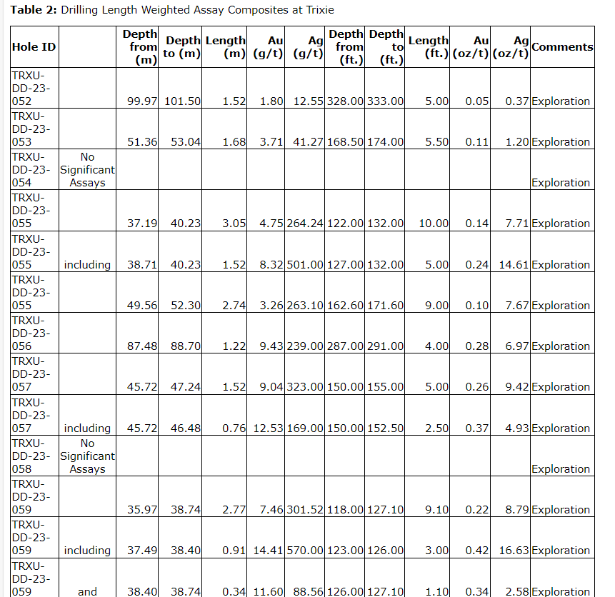 7.46 g/t Au and 301.52 g/t Ag over 2.77 m in hole TRXU-DD-23-059 (0.22 oz/t Au and 8.79 oz/t Ag over 9.10 ft), including: