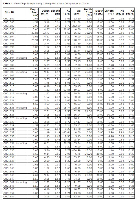 Assay highlights include underground chip samples from 79 new development faces at Trixie. Of these, 35 faces had samples with greater than one gram per tonne gold or greater than 50 g/t silver values. The remaining chip samples returned no significant assays. Selected assay highlights include: