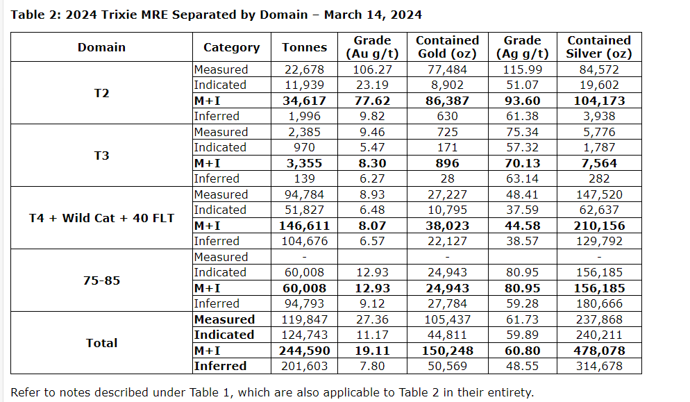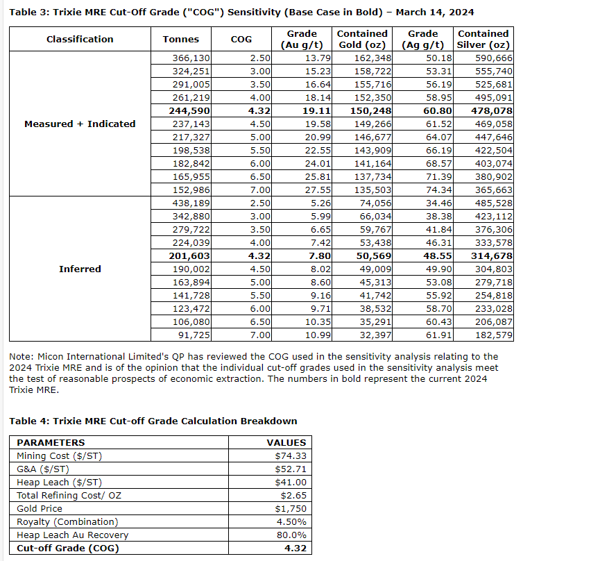 The cut-off grade for the 2024 Trixie MRE is 4.32 g/t Au compared with 4.85 g/t Au in the 2023 Trixie MRE primarily due to the difference in the estimated cost of heap leach processing ($41/ST) relative to the previously estimated mill processing scenario ($89/ST).