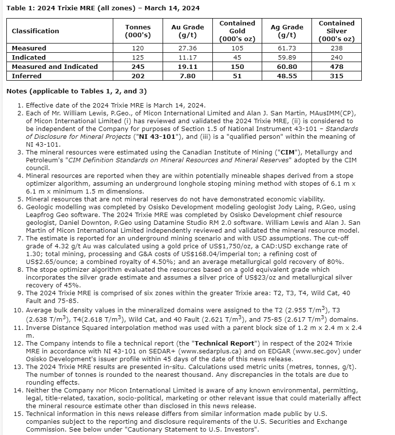 The independent QPs for the 2024 Trixie MRE, within the meaning of NI 43-101, are William Lewis, PGeo, and Alan J. San Martin, MAusIMM (CP), of Micon International Ltd. Each QP is independent of Osisko Development within the meaning of NI 43-101 and has reviewed and approved the content in this news release.