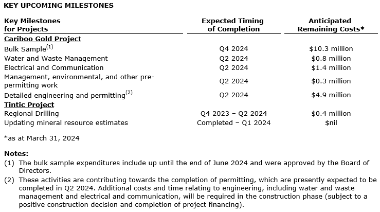 Permitting progress: receipt of the environmental assessment certificate in October, 2023, concluded the EA process for the Cariboo gold project, which was launched in October, 2019; a joint permit application for the B.C. Mines Act and Environmental Management Act is in progress: