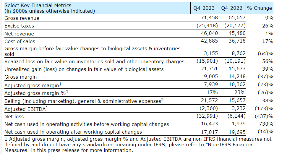 Gross margin before fair value changes to biological assets, inventories sold and other charges declined to $3.2-million from $8.8-million in Q4 fiscal 2022, primarily due to higher inventory provisions and net realizable value adjustments.