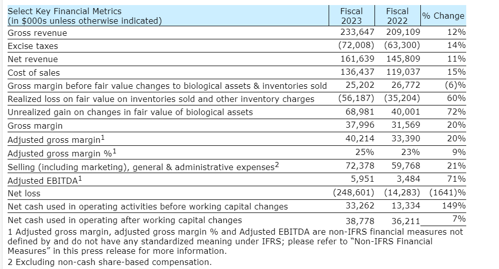 Gross margin before fair value changes to biological assets, inventories sold and other charges declined to $25.2-million from $26.8-million in fiscal 2022, due to higher inventory provision and net realizable value adjustments.