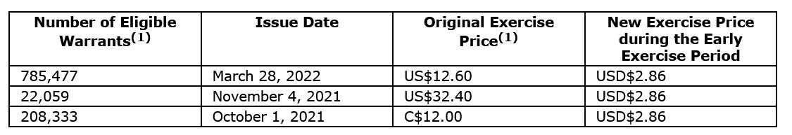 Pursuant to the Program, the Company will amend the exercise price of the following Eligible Warrants to USD$2.86 per Eligible Warrant, commencing on May 18, 2023, at 9:00 a.m. (Vancouver time) and expiring on June 16, 2023 at 5:00 p.m. (Vancouver time) (the "Early Exercise Period"):