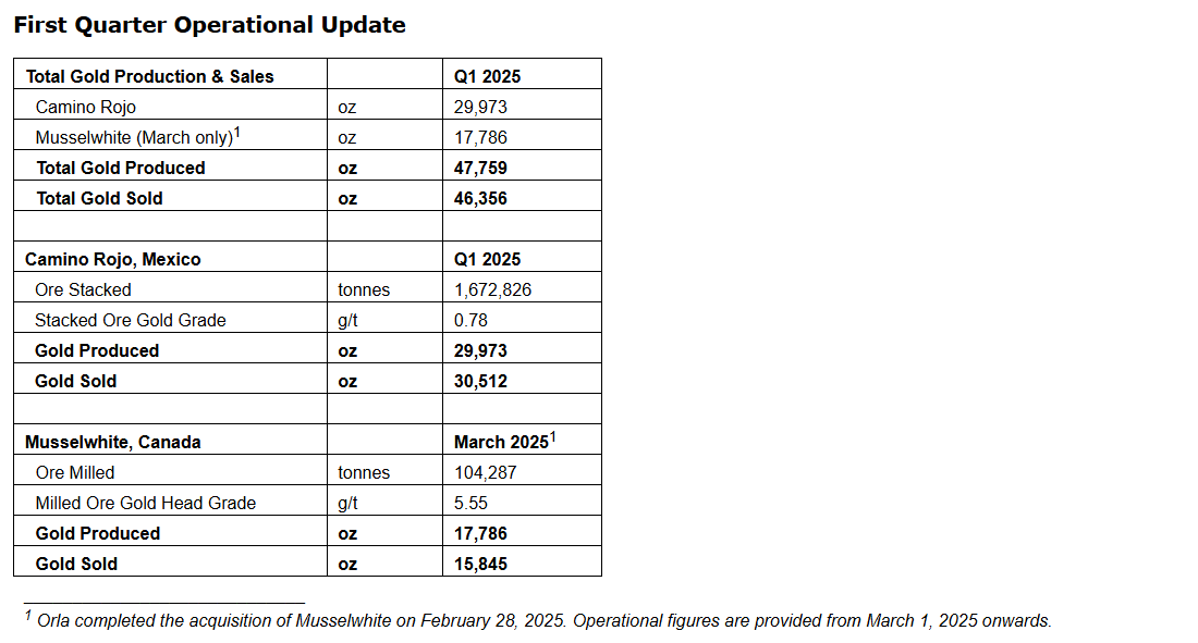 Orla Mining Ltd. has provided an operational update for the first quarter ended March 31, 2025. Camino Rojo is on track to achieve annual guidance of 110,000 to 120,000 ounces of gold following the quarter. Updated 2025 guidance, including the Musselwhite mine, will be provided during the second quarter.