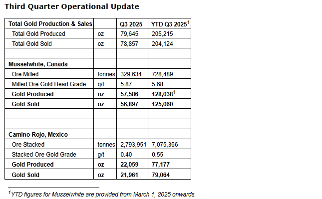ORLA MINING REPORTS STRONG GOLD PRODUCTION FROM MUSSELWHITE IN THIRD QUARTER