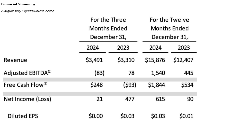 Revenue for the fiscal year ending Dec. 31, 2024, was approximately $15.9-million (U.S.), a historical record for the company and representing a 28-per-cent increase over the comparable year-ago period. Adjusted EBITDA (1) was approximately $1.6-million (U.S.), as compared with approximately $445,000 (U.S.) in the prior year. The increase of approximately $1.2-million (U.S.) in adjusted EBITDA (1) was primarily due to higher revenue and better utilization of labour. Adjusted free cash flow (1) was $1.8-million (U.S.), which was after capital expenditures of approximately $112,000 (U.S.), as compared with $530,000 (U.S.) in 2023.