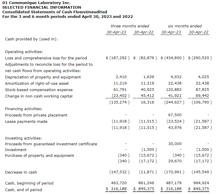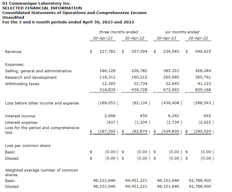 01 Communique Laboratory Inc. has released the company's second quarter fiscal 2023 results, which ended April 30, 2023.