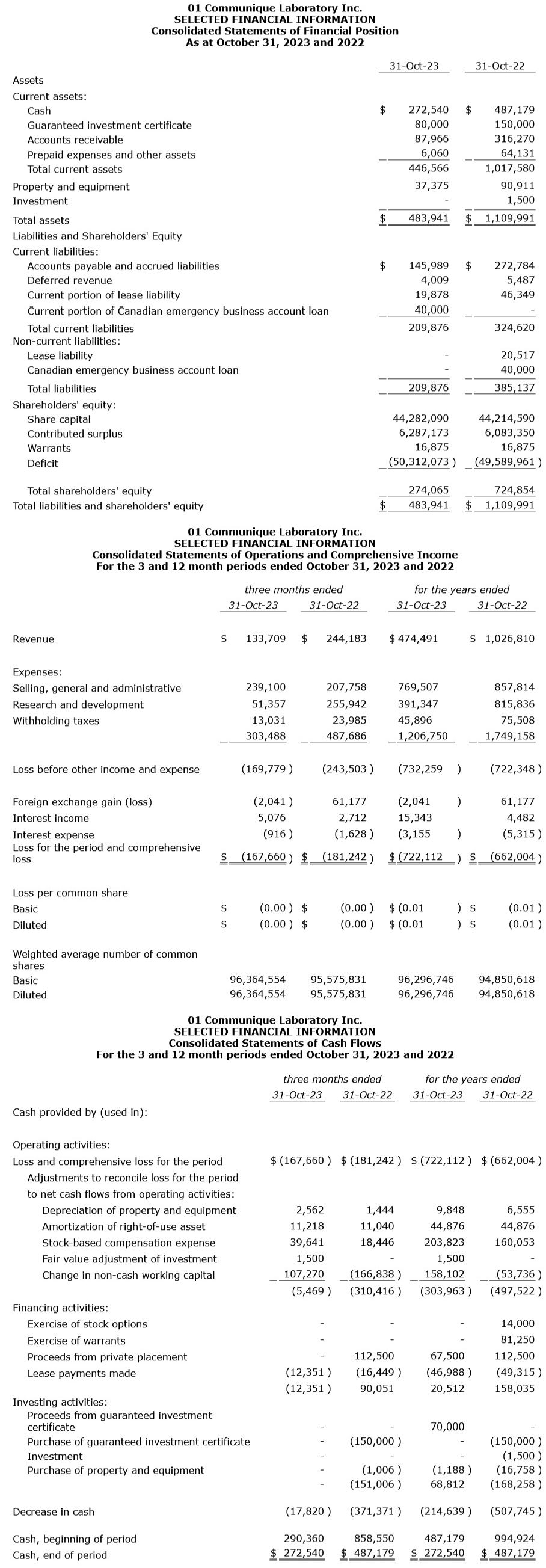 01 Communique Laboratory Inc. has released its fourth quarter fiscal 2023 results, which ended Oct. 31, 2023.