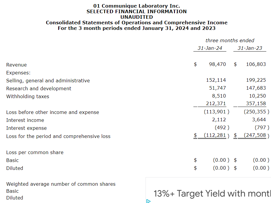 01 Communique Laboratory Inc. has released its first quarter fiscal 2024 results, which ended Jan. 31, 2024.