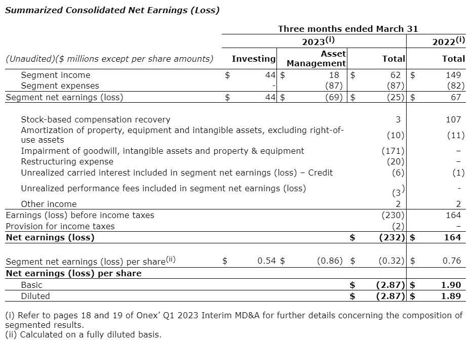 Onex Corp. has released its financial results for the first quarter ended March 31, 2023.