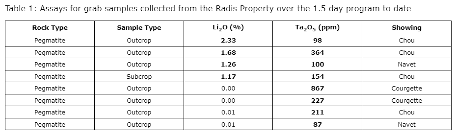 The 2023 exploration program began on June 2 and extended for just 1.5 days before being paused due to regional forest fires at the request of the ministry (see news release dated June 5, 2023). While on site, field crews targeted the historically documented lithium/spodumene pegmatite outcrop occurrences identified from data compilation. Over this 1.5-day period, a total of 11 samples were collected from 10 outcrops and one boulder. Of these samples, four returned values greater than 1 per cent Li2O, up to a peak value of 2.33 per cent Li2O (see the table entitled "Assays for grab samples collected from the Radis property over the 1.5-day program to date"). The results confirm the presence of spodumene pegmatite on the property at two locations -- the Chou showing (2.33 per cent Li2O) and Navet showing (1.26 per cent Li2O), separated by approximately 2.1 kilometres.
