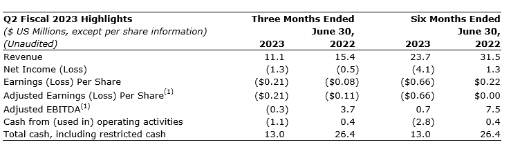 Adjusted earnings before interest, taxes, depreciation and amortization (EBITDA) (1) for Q2 2023 decreased to a loss of $300,000, as compared with $3.7-million during the same period in 2022, primarily driven by lower gross margin.
