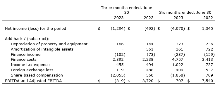 EBITDA and adjusted EBITDA are not financial measures calculated and presented in accordance with IFRS and should not be considered in isolation or as a substitute to net income (loss), operating income or any other financial measures of performance calculated and presented in accordance with IFRS, or as an alternative to cash flow from operating activities as a measure of liquidity. The company defines EBITDA as net income (loss) excluding amounts for depreciation and amortization, other income, finance costs, finance income, income tax expense (recovery), foreign exchange gain (loss), and share-based compensation. The company defines adjusted EBITDA as EBITDA (as defined above), excluding restructuring costs, one-time provision amounts and any one-time transaction costs associated with shareholder conflict. The company believes that adjusted EBITDA is a metric that investors may find useful in understanding the company's financial position. The attached table provides a reconciliation of net income to EBITDA and adjusted EBITDA (in thousands of U.S. dollars).