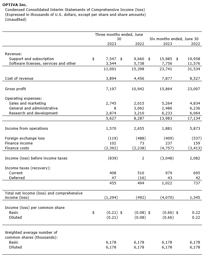 OPTIVA INC. REPORTS SECOND QUARTER 2023 FINANCIAL RESULTS