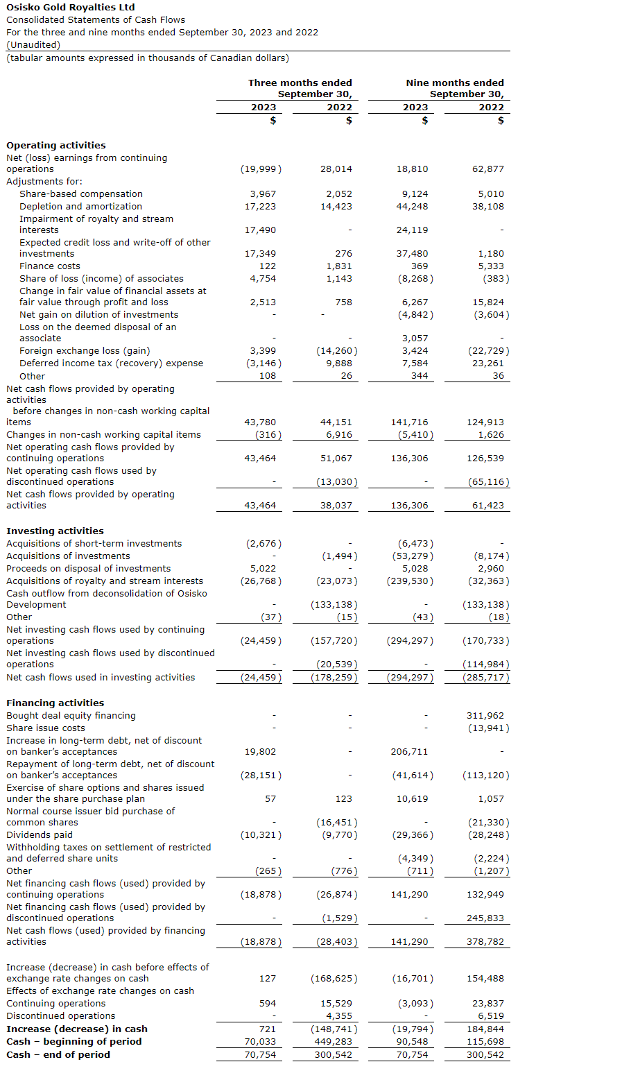 Osisko Gold Royalties Ltd. today released its consolidated financial results for the third quarter of 2023. Amounts presented are in Canadian dollars, except where otherwise noted.