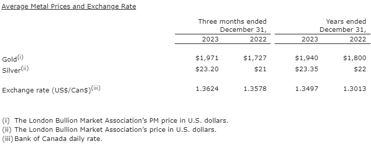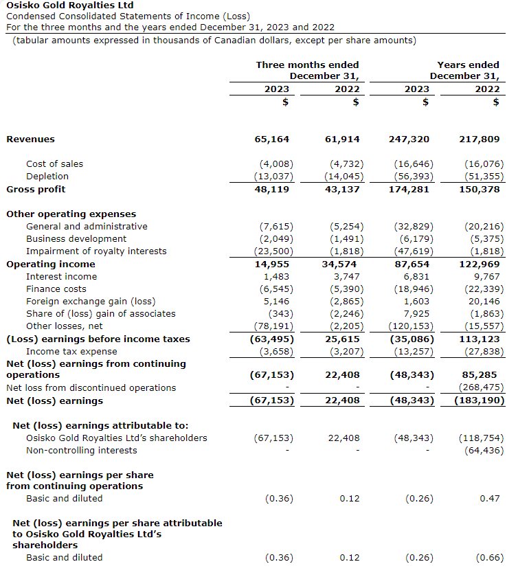 Osisko Gold Royalties Ltd. has released its consolidated financial results for year-end 2023. Amounts presented are unaudited and in Canadian dollars, except where otherwise noted.