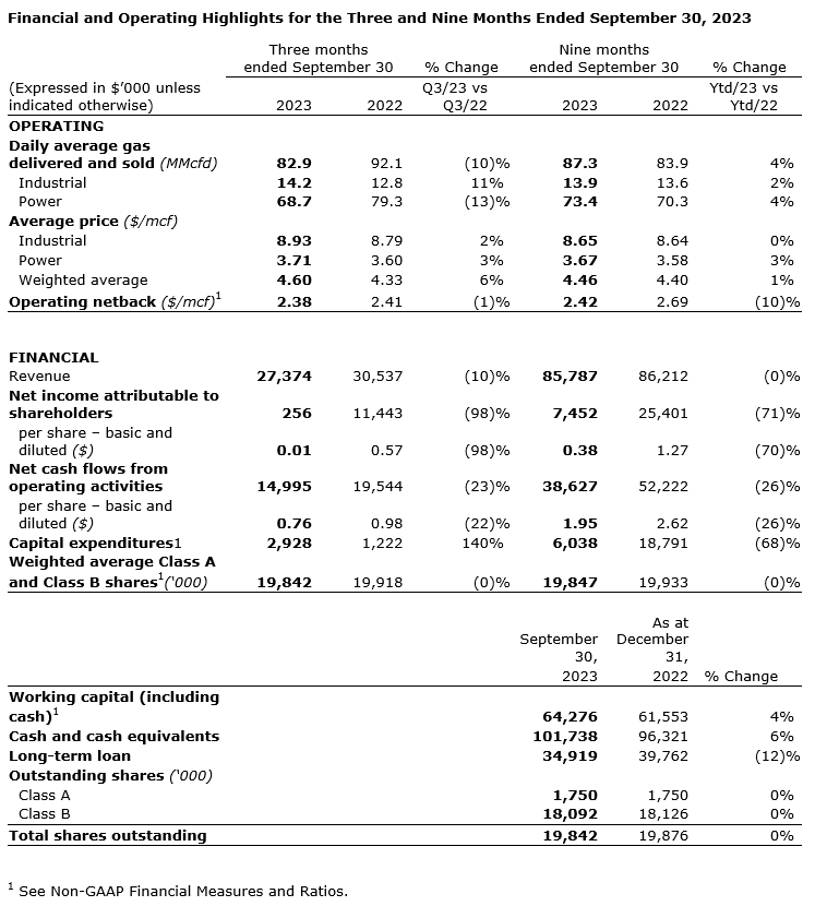 - Gross conventional natural gas production was lower than forecast for the quarter and averaged 124.8 mmcfd for Q3 2023, of which 82.9 mmcfd was additional gas. Gas deliveries decreased by 10 per cent for Q3 2023 and increased by 4 per cent for the nine months ended Sept. 30, 2023, compared with the same prior-year periods. The decrease for Q3 2023 was primarily due to declining production from the currently producing wells and reservoir compartments in the Songo Songo field. The increase for the nine months ended Sept. 30, 2023, was primarily due to increased gas sales to the power sector.