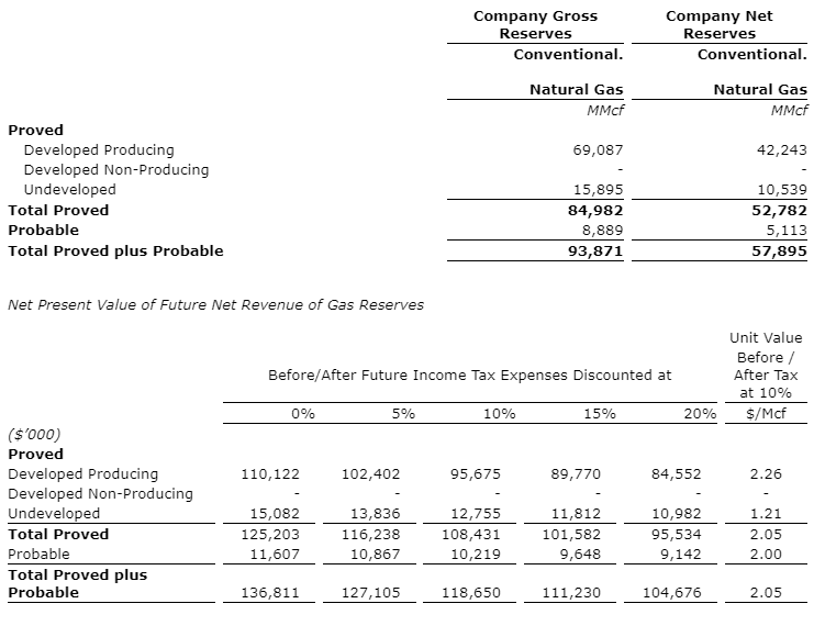 The following tables outline the Company's conventional natural gas reserves as at December 31, 2023 and the net present value of future net revenue attributable to such reserves as evaluated in the McDaniel Report utilizing McDaniel's forecast price and cost assumptions to the end of the Songo Songo Licence term in October 2026.