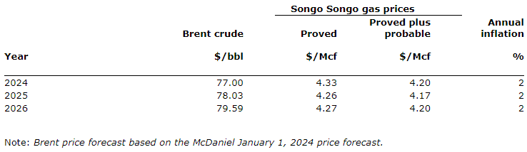McDaniel employed the following gas sales, pricing and inflation rate assumptions as of December 31, 2023 in estimating the Company's reserves data using forecast prices and costs. The Company received an average gas price of $4.52/Mcf in 2023 and $4.16/Mcf net of the transportation tariff imposed by Songas Limited as determined by the energy regulator, EWURA.
