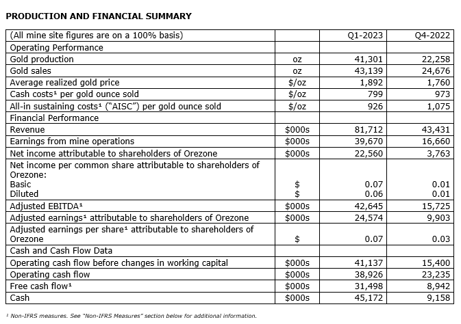 - Adjusted earnings and adjusted earnings per share (basic) attributable to Orezone shareholders of $24.6-million and seven cents, respectively;