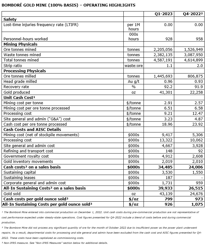 Patrick Downey, president and chief executive officer, commented: "Earnings from mine operations exceeded $39-million in Bombore's first full quarter of commercial production and have provided a strong start to the company's net earnings and free cash flow for 2023. Gold production of 41,301 ounces was helped by excellent performance of the process plant with mill throughput at 13 per cent above design and recoveries at a steady 92.2 per cent. Our operational efficiency and stringent cost management assisted in offsetting cost pressures from a stronger local currency and high in-country diesel prices. With robust gold prices, AISC margin was $966 per oz sold or an impressive 51 per cent.