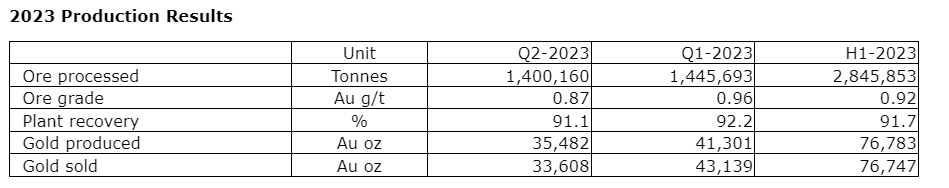 "Gold production benefited from the reclaim of higher-grade stockpiles in the first half of the year with head grades expected to continue to moderate in the second half. The company reaffirms its 2023 annual production guidance of 140,000 to 155,000 ounces.