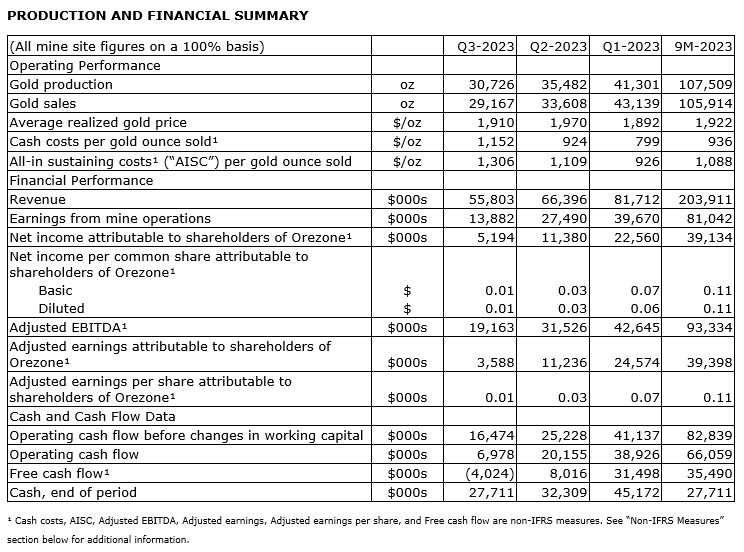 OREZONE REPORTS THIRD QUARTER 2023 RESULTS