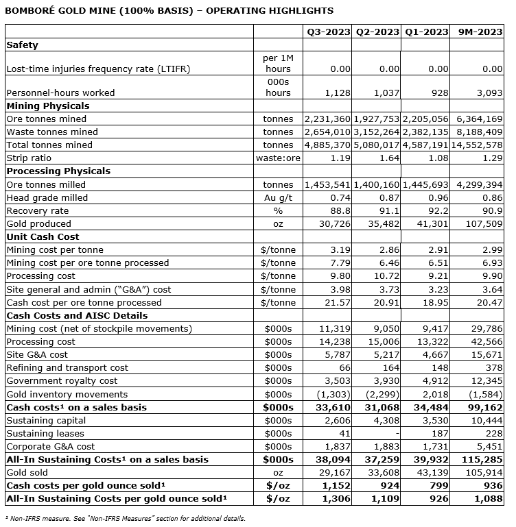Patrick Downey, president and chief executive officer, commented: "Our Bombore mine continues to perform well operationally, with third quarter plant throughput reaching a record high of 1.45 million tonnes, which is 13 per cent above design. Gold production declined modestly from earlier quarters as lower head grades in Q3 reflects the processing end in Q2 of higher-grade stockpiles accumulated during construction. To improve mining rates, which were behind plan, we mobilized a second mining contractor in late July. We are now realizing the benefits in Q4 as mining rates in October reached a new monthly record. With faster ore release and continued strong plant performance, Q4 production is forecasted to be above Q3, which positions us well to meet our previously guided gold production and costs for 2023.