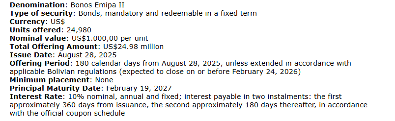 On Aug. 27, 2025, EMIPA received the regulatory approval of the $24.98-million (U.S.) EMIPA Bonds II issuance and subsequently announced its intention to launch the offering on a best-efforts basis through the Bolivian Stock Exchange.