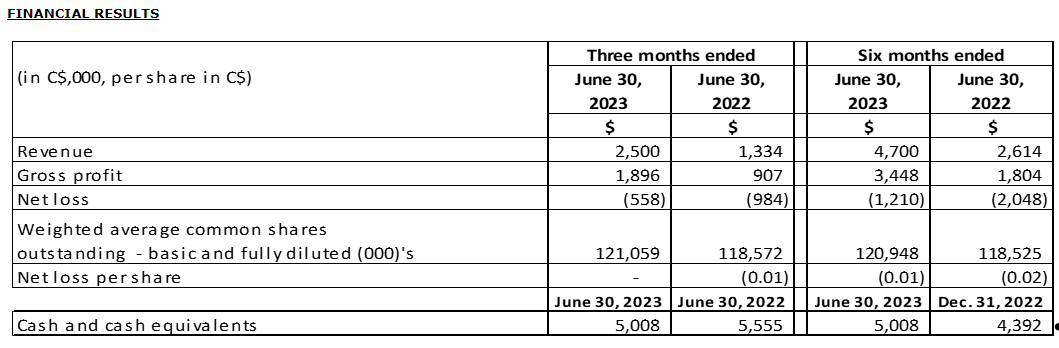 - Adjusted EBITDA (earnings before interest, taxes, depreciation and amortization), a non-GAAP (generally accepted accounting principles) measure reconciled to the net loss in the MD&A filed on SEDAR+, improved from a loss of $700,000 in Q2 2022 to a loss of $200,000 in Q2 2023.
