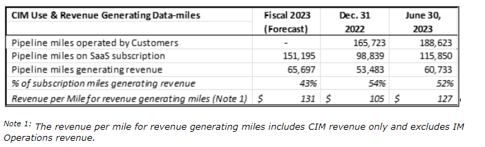 An attached table estimates the miles of customers' pipelines operated, miles that are subject to multiyear SaaS (software as a service) agreements and miles of pipeline data ingested into CIM for which revenue was earned (data miles).